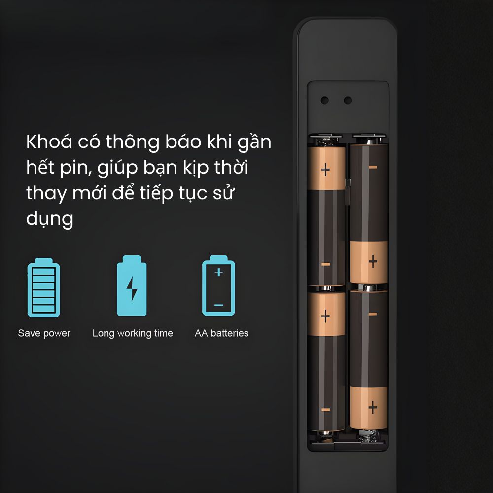 Khoá cửa nhôm được hỗ trợ bởi 4 pin AAA chất lượng cao, thời gian sử dụng từ 4 – 6 tháng (Tuỳ theo mức độ sử dụng của mỗi khách hàng)  Khoá TTLock cũng có báo động khi gần hết pin và có cổng sạc USB để cấp nguồn khẩn cấp. Trước khi hết pin, sẽ có cảnh báo “Battery Low” nguồn điện yếu, cảnh báo bạn phải thay pin và lưu ý nên mang chìa cơ theo khi bạn ra khỏi nhà. Trường hợp khóa đã hết pin, bạn cũng có thể sử dụng sạc dự phòng để cung cấp nguồn cho khóa hoạt động tạm thời.